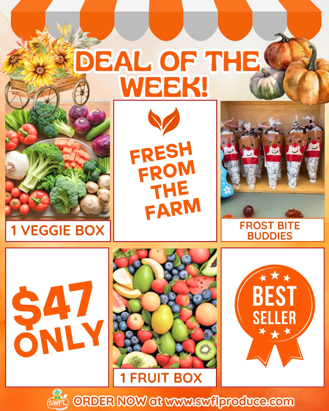 1 Fruit Box, plus 1 Veggie Box plus Frostbite Buddies From Mom’s Fold Bakery!