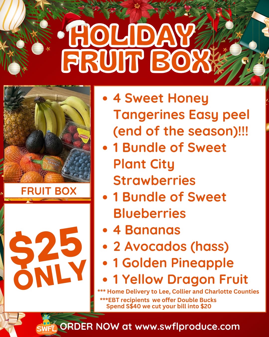 Weekly Co Op Share!! Home Delivery www.swflproduce.com Text or call 239-464-6595 with any questions Fruit Box -$25.00 7-9 Different Fruits Filling a 1/2 bushel box