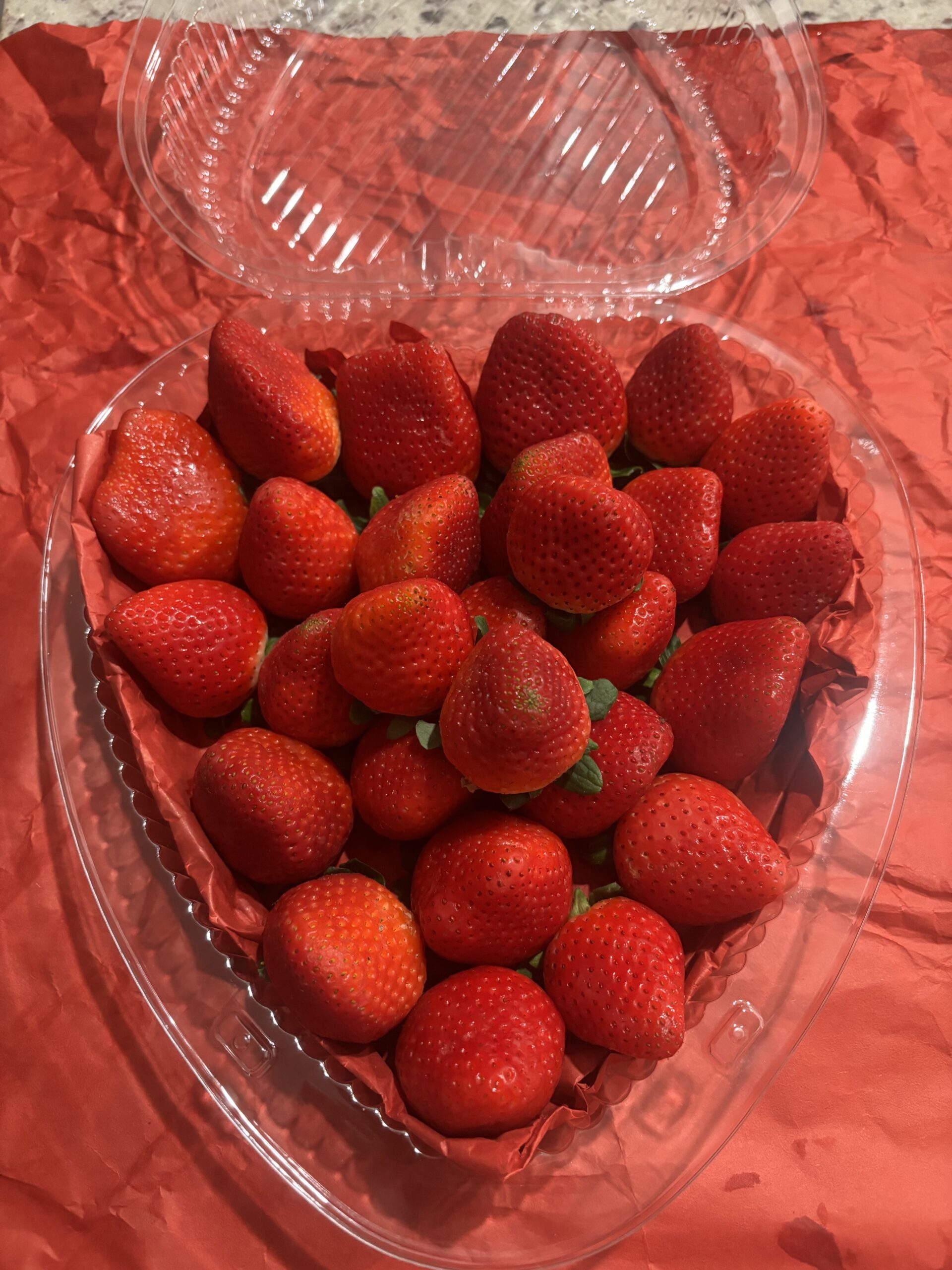 Large Heart Shaped contained lined with pink-red tissue paper filled witht hte largest strawberries we can find. This set is perfect for a friend, neighbor or loved one. The strawberries will be the perfect size for dipping in chocolate.