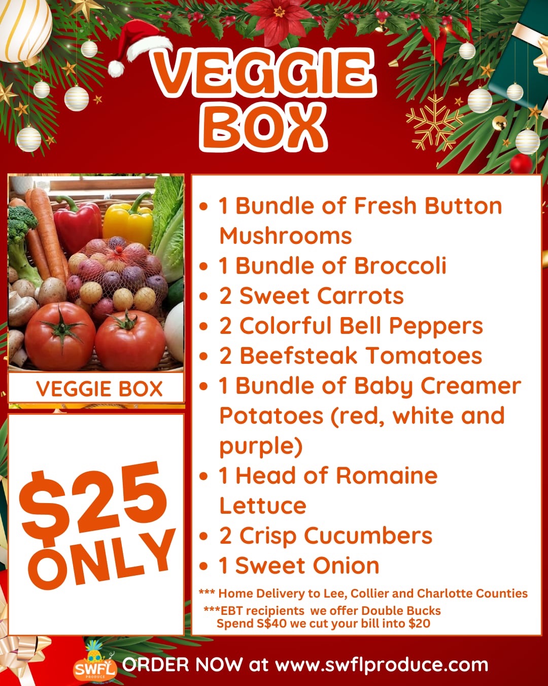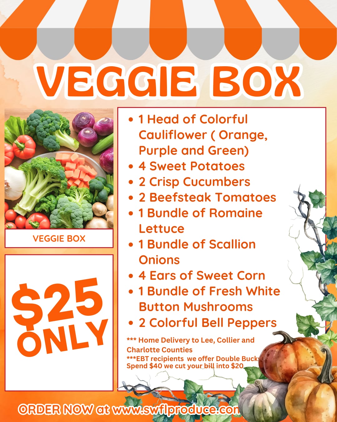 Weekly Co Op Share!! Text or call 239-464-6595 with any questions Vegetable Box -$25.00 7-9 Different Veggies Filling a 1/2 bushel box EBT half off